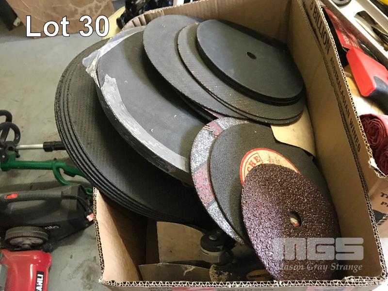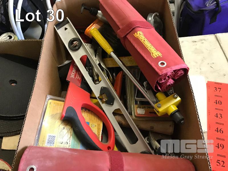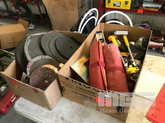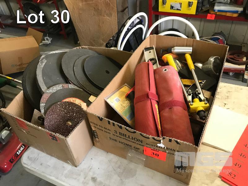 POP RIVET GUN, SPIRIT LEVEL, SET SQUARE, 2 x SIDCHROME FABRIC SPANNER HOLDERS, LARGE QUANTITY GRINDING & CUT OFF DISCS, 2 x BOXES