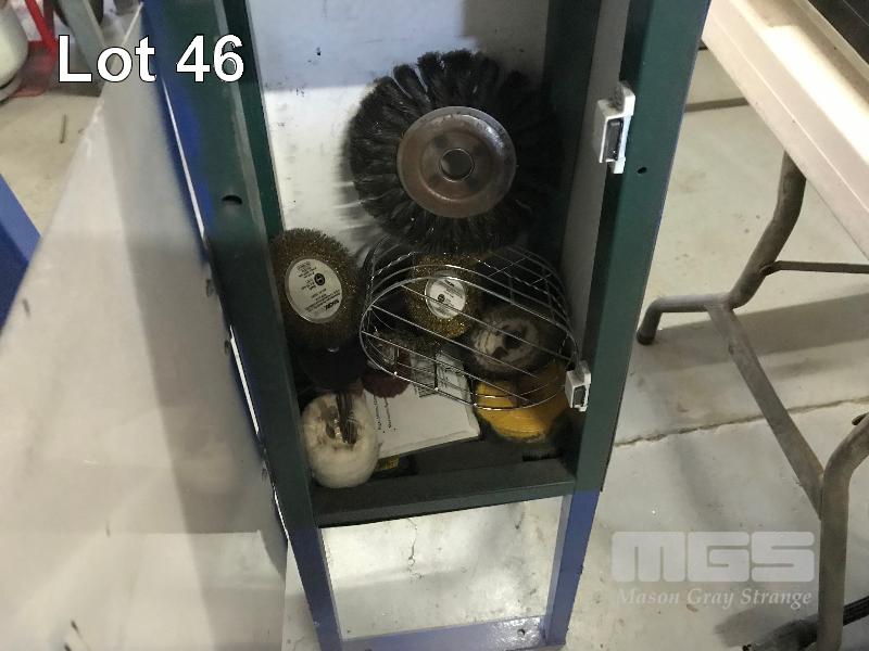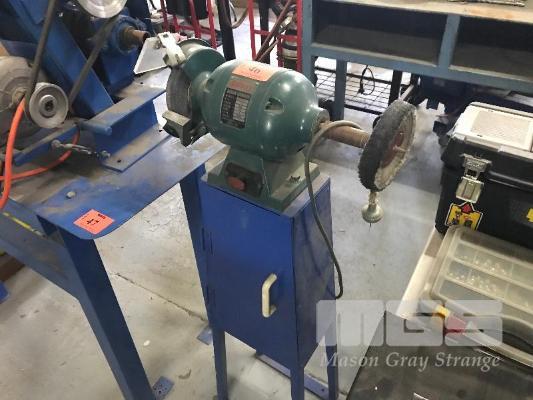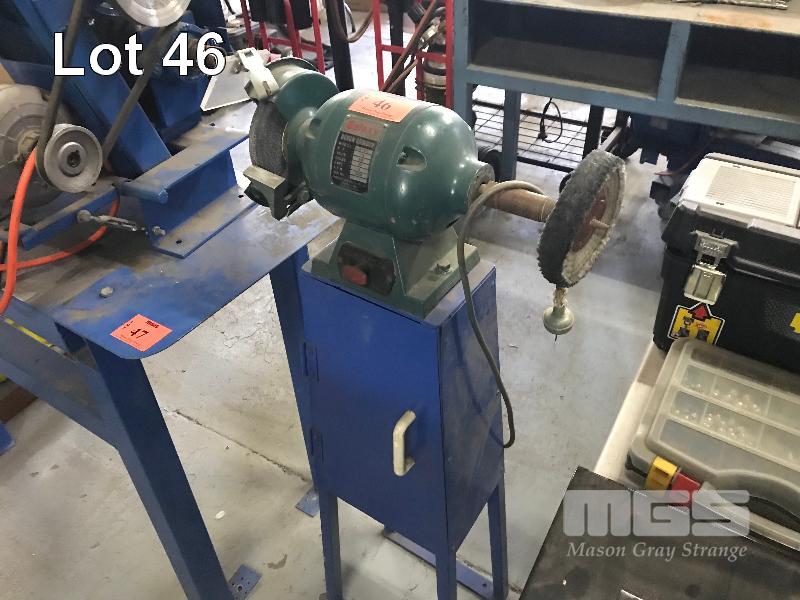 GALAXY BENCH GRINDER MOUNTED ON FABRICATED CABINET CONTAINING WIRE & BUFF WHEELS, 240V