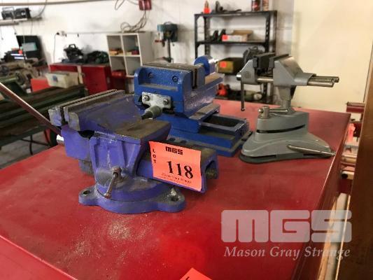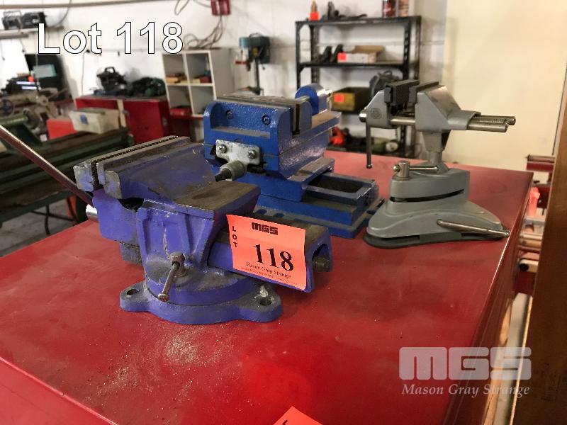 3 X ASSORTED VICES INC PIVOTING BENCH VICE, TRAVERSING MACHINIST VICE & SUCTION BASED VICE