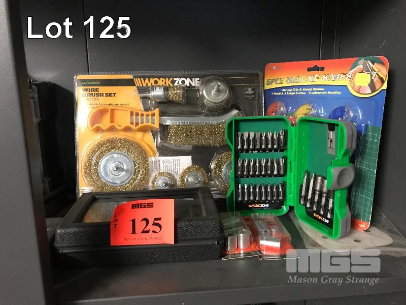 ASSORTED TOOL KITS AND HARWARE PACKS, DRILL BITS & KITS, WIRE BRUSH SET, UTILITY KNIVES, SCREW DRIVER KITS ETC