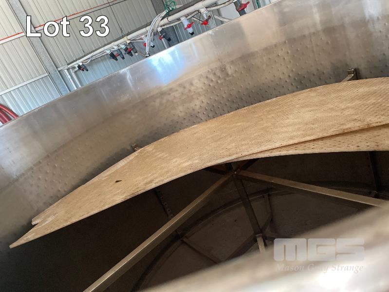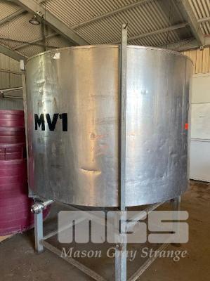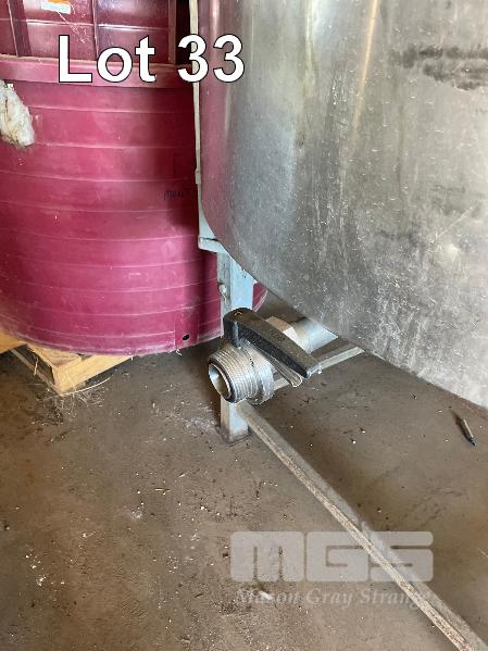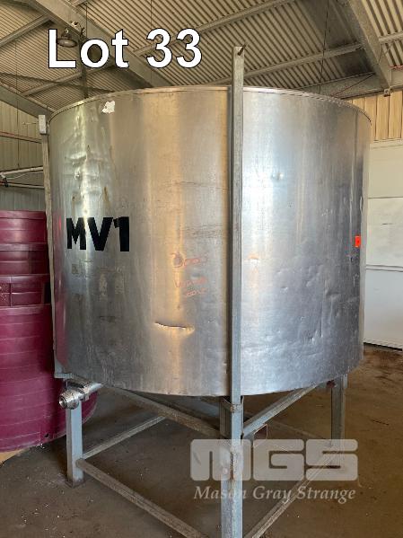 FERMENTATION TANK, STAINLESS STEEL & HEADING DOWN BOARD 3,000 LITRE WITH JACKET COOLING INTERNAL PANEL (INSPECTION REQUIRED) ON FORK MOUNT STEEL BASE (HAIRLINE CRACK IN INSULATED JACKETING INSIDE TANK)