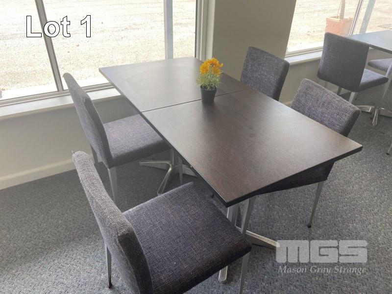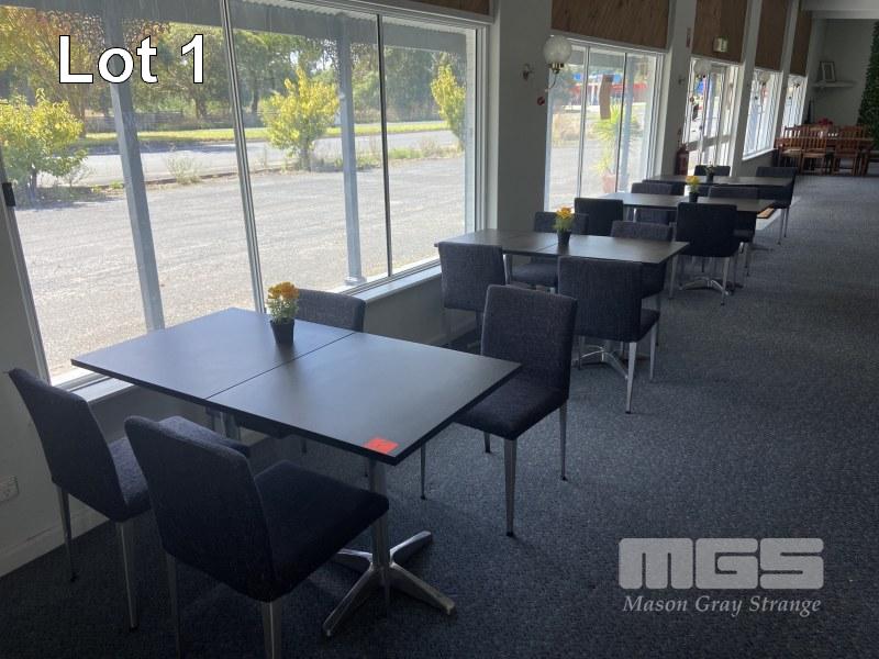 8 x TABLES, 700 x 700mm DARK LAMINATE FINISH, CHROME BASE & 16 x CLOTH & STEEL FRAME CHAIRS