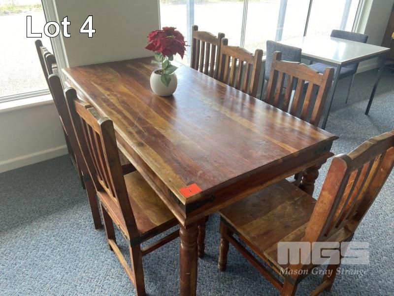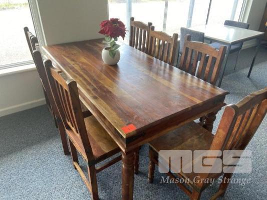 TIMBER DINING ROOM TABLE, 1800 x 900mm & 7 x TIMBER CHAIRS