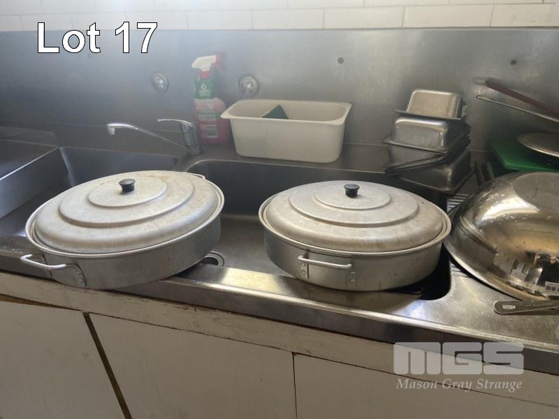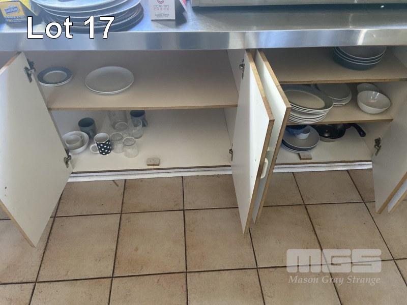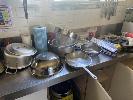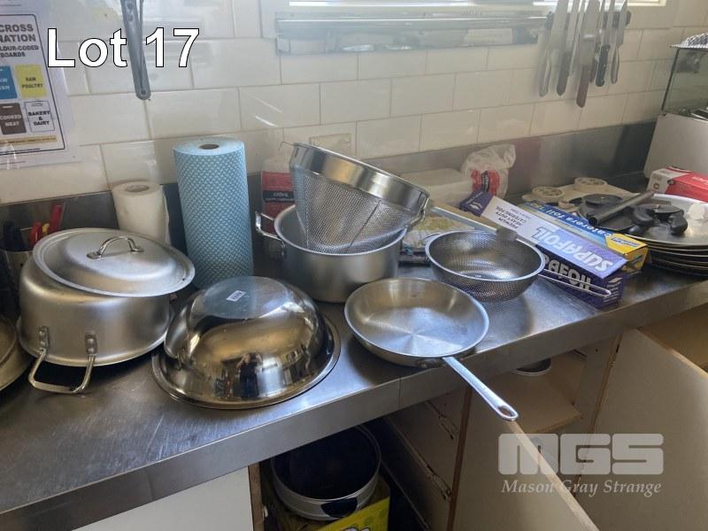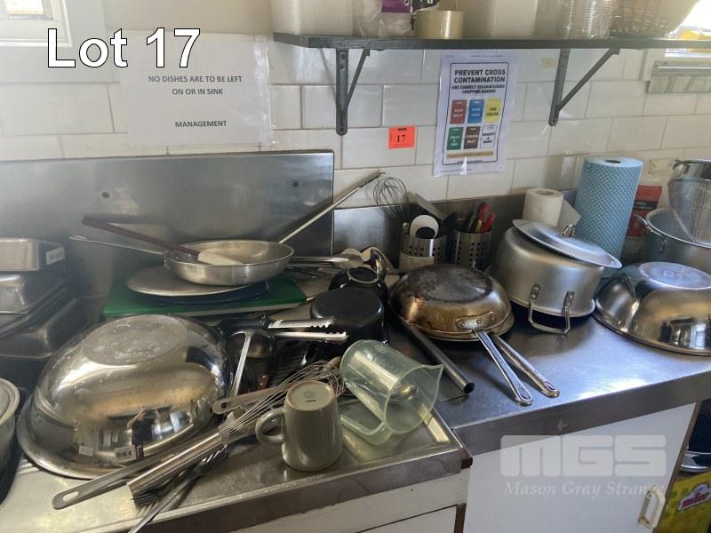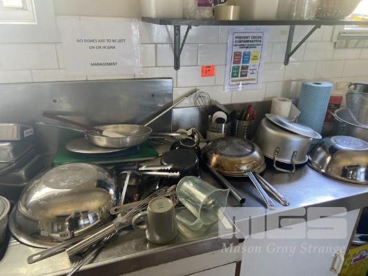 CONTENTS BENCHTOP & CUPBOARDS BELOW INC POTS, PANS, MIXING BOWLS, KITCHEN UTENSILS, WASHING DETERGENT, FOIL, PIZZA TRAYS & ACCESSORIES, PLATES, BOWLS, ETC