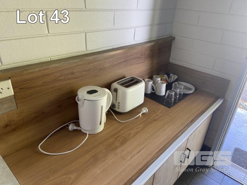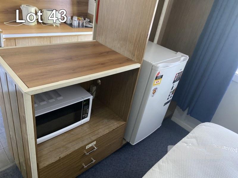 ROOM 16 CONTENTS DOUBLE & SINGLE BED, BAR FRIDGE, MICROWAVE, TOASTER & KETTLE, AVA 32" TV WITH REMOTE MOD: 32SSI SIDE TABLE, COUCH & COFFEE TABLE KELVINATOR WALL MOUNT A/C, IRON & BOARD