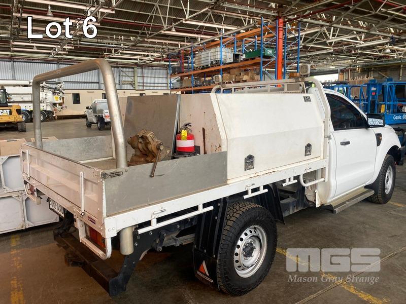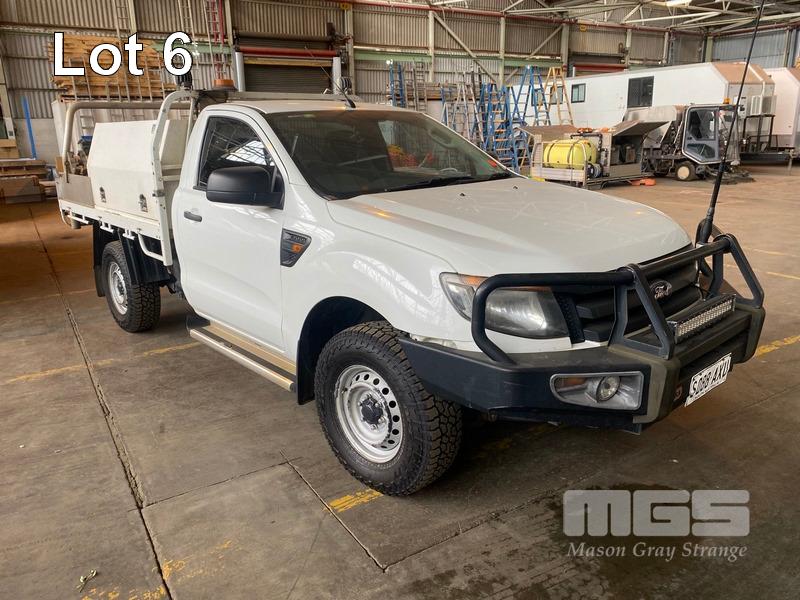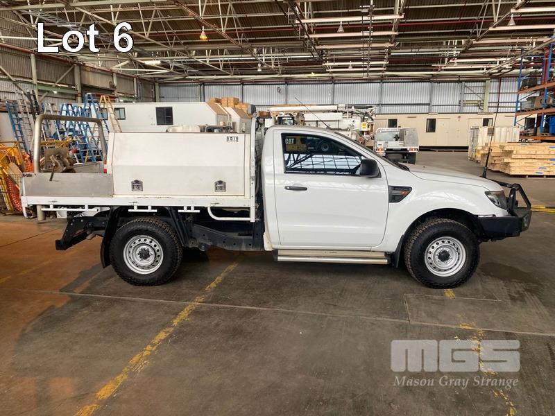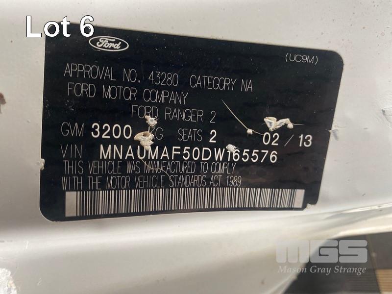 2013 FORD RANGER SINGLE CAB UTILITY 4x4 REG: S088 AXU VIN: MNAUMAF50DW165576 ODO: 200,622km SHOWING 3.2 LITRE, 6 SPEED AUTOMATIC TRANSMISSION, TURBO DIESEL, 2 SEAT, 4x4 TOW BAR, 2400 x 1800mm STEEL TRAY RACKING 2 x TOOLBOXES, 1500 x 700 x 500mm (D) POST VICE LED LIGHT BAR 2 WAY RADIO WORK LIGHTS TO REAR SIDE STEPS, SAFETY LIGHT BULL BAR (WITH 1 KEY/S, WITH OWNER'S MANUAL)