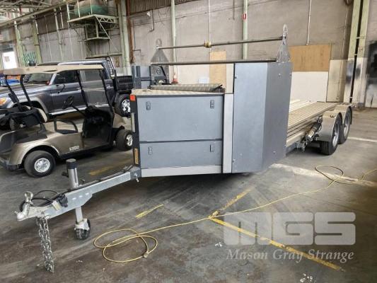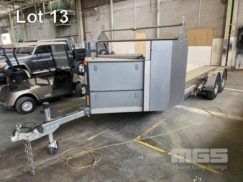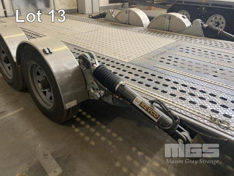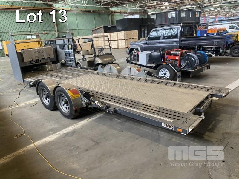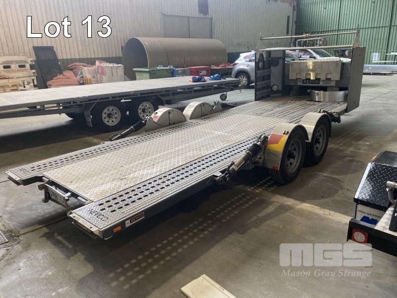 2014 NEVCO RACE CAR TANDEM TRAILER, MODEL: EZYAPPROACH, ATM: 3,600kg, TARE: 1,620kg, 5800 x 1970mm TRAY, ELECTRO HYDRAULIC RISE & FALL/ TILT, FITTED WITH LOCK DOWN POSITIONING RAILS, ELECTRIC SUPER WINCH, TYRE RACK, NEVCO ACCESSORIES, LED LIGHTING, FRONT STORAGE COMPARTMENT, 6 STUD 16 INCH WHEELS, ADJUSTABLE DRAWBAR, ELECTRIC BRAKES, 50mm COUPLER, REGO: S758TGI, VIN: 6T9T27R02E0927005 (HAD VERY LITTLE USE)
