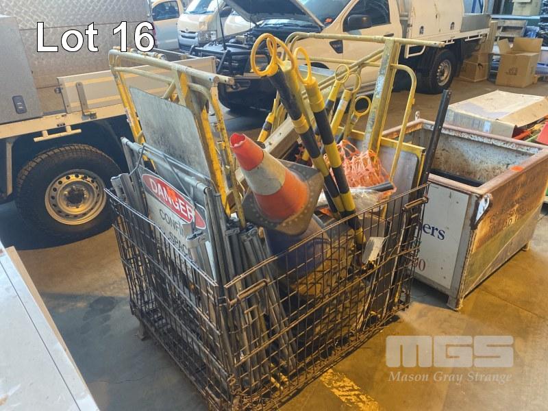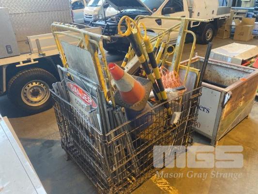 BASKET STILLAGE OF WITCHES HATS, BUNTING, ROADWORKS SIGNS ETC.