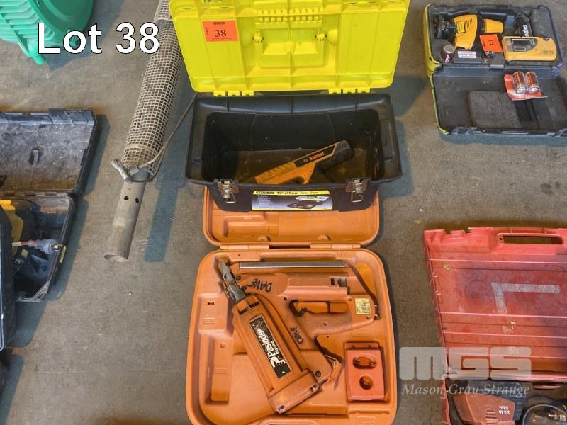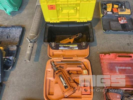 PASLODE BATTERY NAIL GUN, (NO BATTERY), PLUS RAMSET CHARGE GUN & STANLEY TOOL BOX