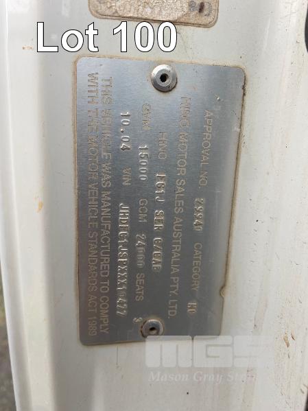 2004 HINO FGIJ 4x2 EXTENDED WHEEL BASE VAC PUMP TRUCK REG: SB 02 VX VIN: 1000SUSME036 ODO: 500,000 (AS PER SERVICE RECORD GVM: 15,000kg GCM: 24,000kg MANUAL, FITTED WITH 2014 RING-O-MATIC VAC PUMP, TYPE: 1000HICFM/SKID MOD: 1000 HIGH CFM