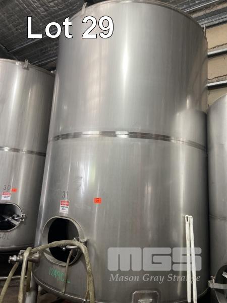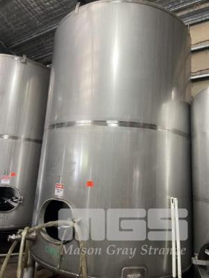 UPRIGHT STAINLESS STEEL TANK, 12,490 LITRE APPROX SIDE AND TOP, ACCESS HATCHES, CONVEX BOTTOM CENTRE DRAIN
