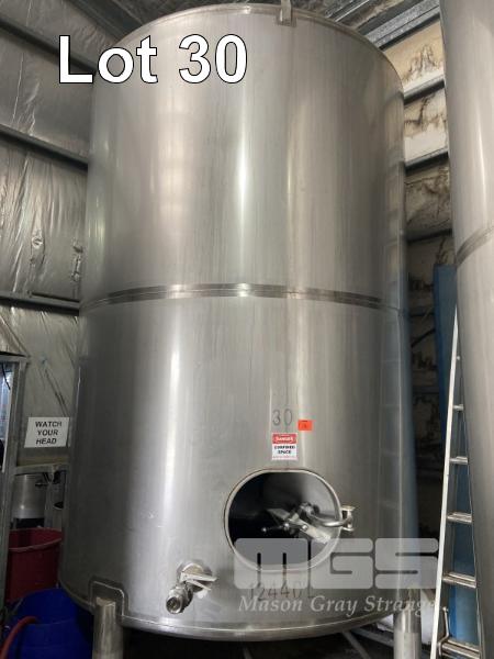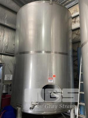 UPRIGHT STAINLESS STEEL TANK, 12,490 LITRE APPROX SIDE AND TOP, ACCESS HATCHES, CONVEX BOTTOM CENTRE DRAIN