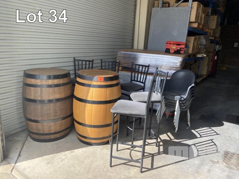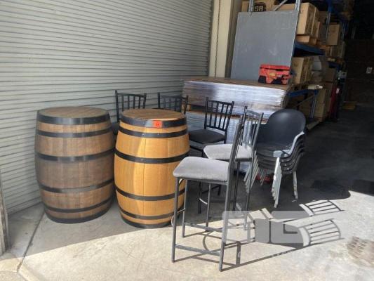 2 x WINE BARRELS, 5 x MATCHING BAR STOOLS, FELT & STEEL BLACK FRAME & 7 x ASSORTED CHAIRS