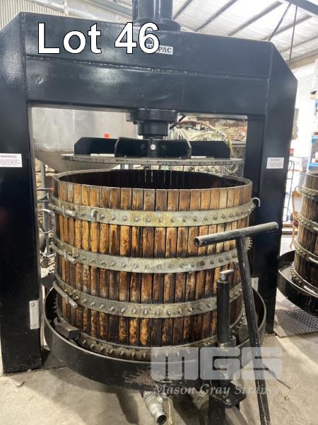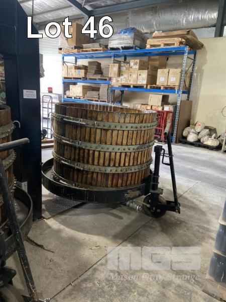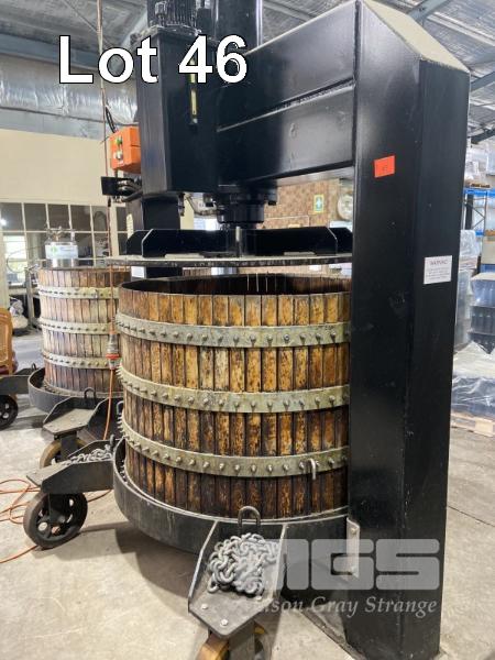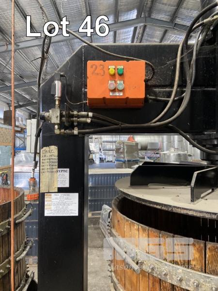 HYPAC HYDRAULIC BASKET PRESS 2 x BASKETS 1350mm DIAM x 100mm (H) ON 2 x TROLLEYS (PURCHASER TO REMOVE, CONCRETED INTO THE FLOOR, ONSITE MANAGER WILL ASSIST)