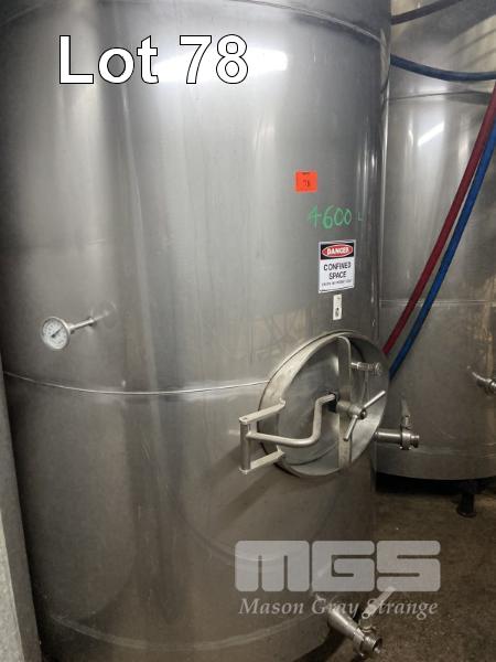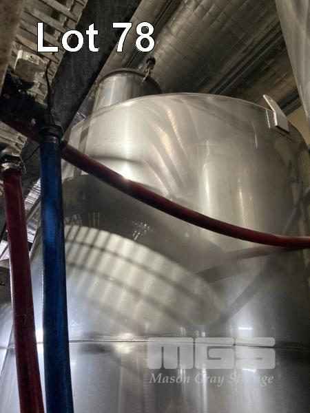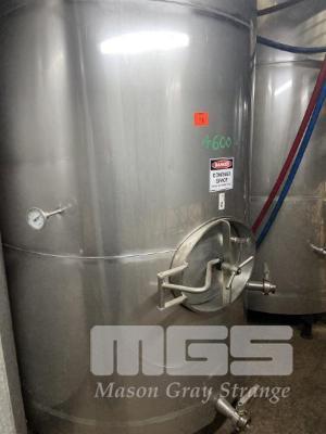 STAINLESS STEEL UPRIGHT TANK, 4,600 LITRE ON SHORT LEGS, COOLING JACKET JOHN TRINNIE ENG TOP & SIDE ACCESS HATCHES TAPERED BOTTOM & VALVES