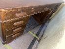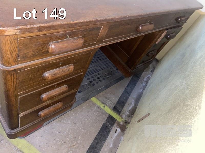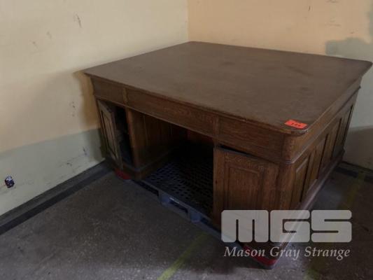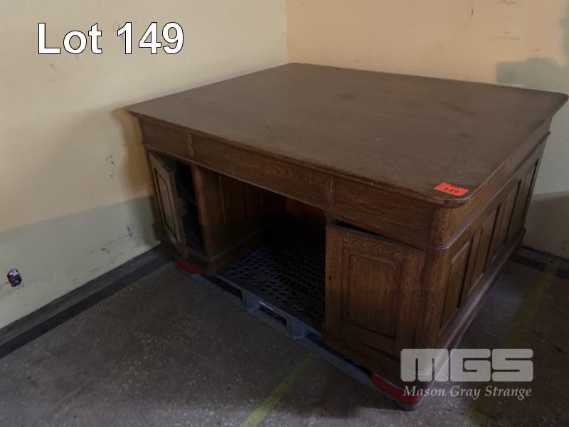 ANTIQUE TIMBER DESK, DOUBLE SIDED, 1530 x 1200mm, 9 DRAWER, 2 DOOR CUPBOARD, EX TOM PLAYFORD NICE PIECE OF SA. HISTORY.