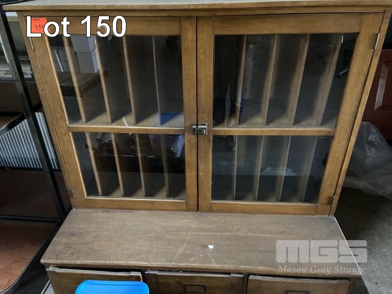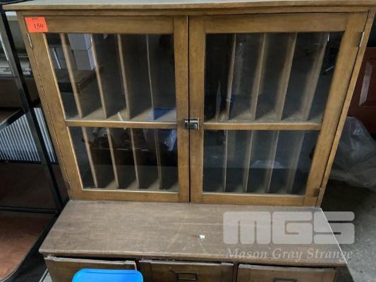 UNIQUE ANTIQUE TIMBER FILE CABINET, 2 DRAWER, 2 x GLASS DOORS EX TOM PLAYFORD.