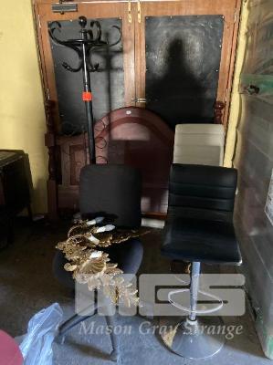 COAT RACK, WINE BOTTLE RACK, ROCKING CHAIR & TIMBER BED END