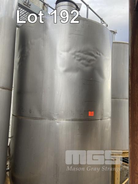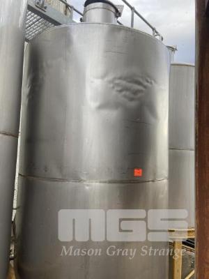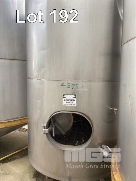 STAINLESS STEEL UPRIGHT TANK, 4,500 LITRE ON SHORT STAND TOP & SIDE HATCHES TAPERED BASE