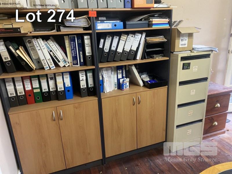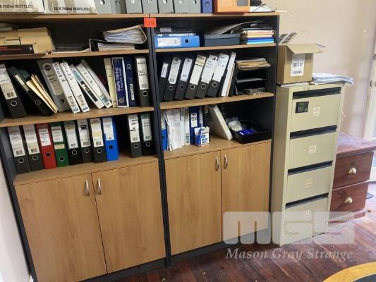 2 x SIDE UNITS, BEACH/STORM LAMINATE, 2 DOOR, 3 SHELF, 1800 (H) x 900mm (W) & 2 x 4 DRAWER FILING CABINETS, STEEL