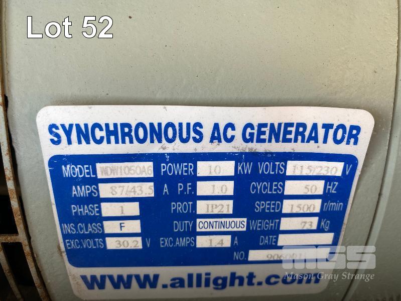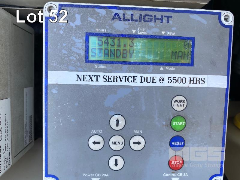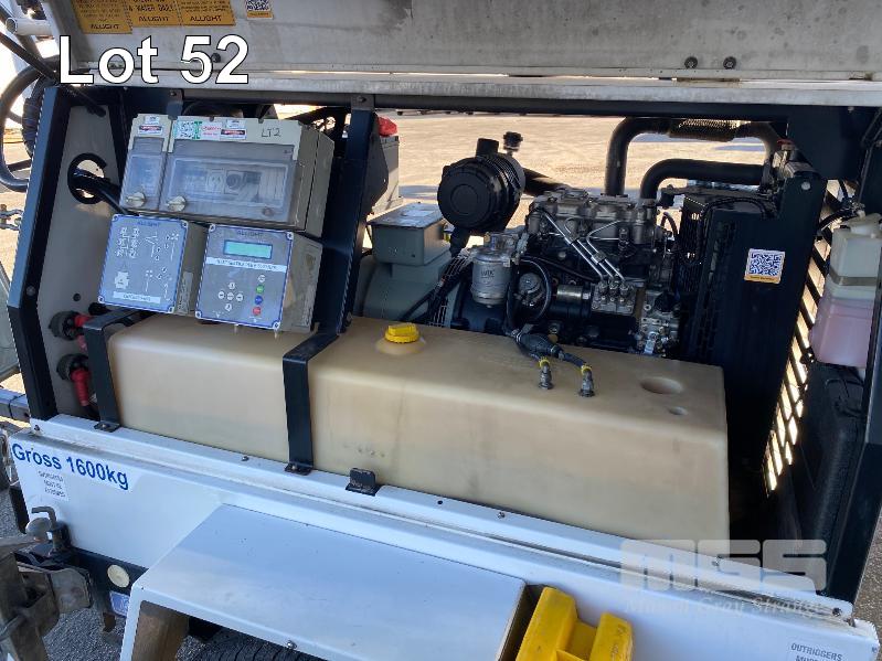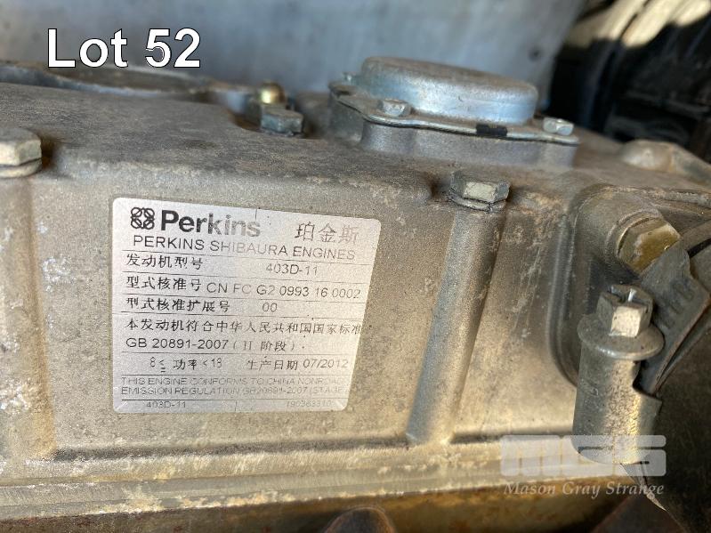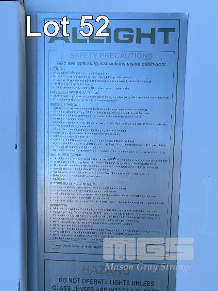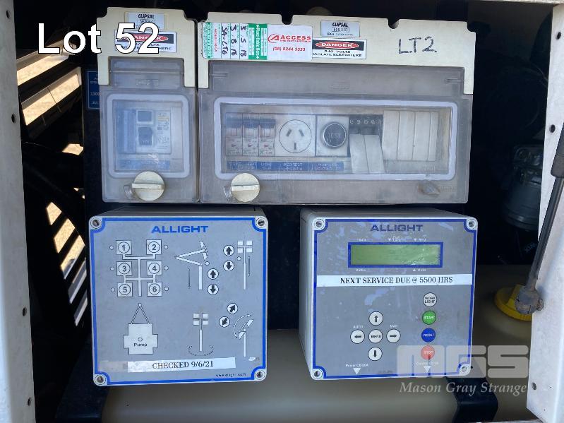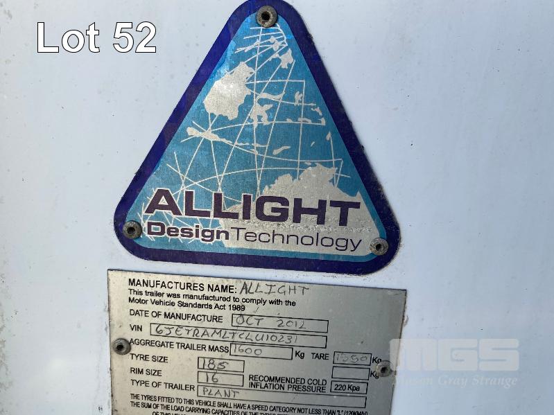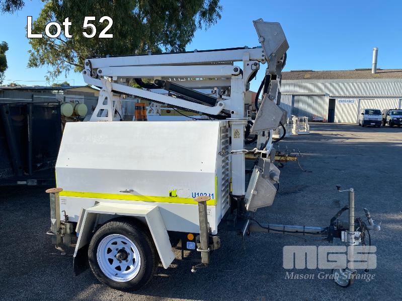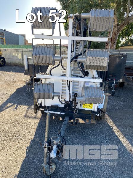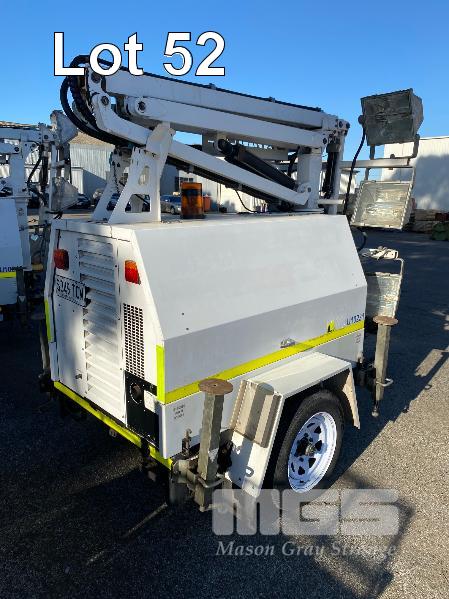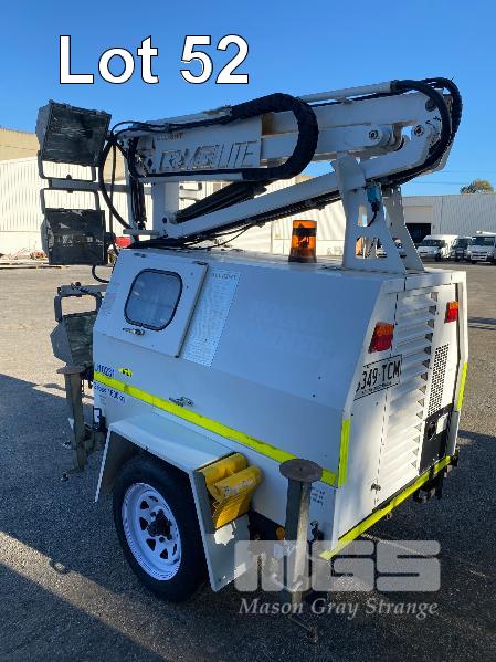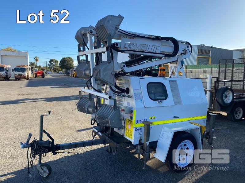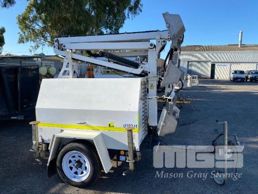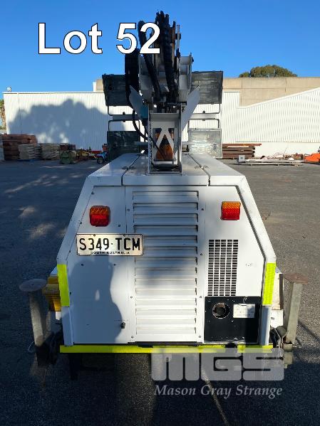 LIGHTING TOWER, ALLIGHT COMBI LITE TRAILER MOUNTED REG: S349 TCM VIN: 6JETRAMLTCLU10231 DOM: 10/2012 SINGLE AXLE BALL HITCH, BRAKES POWERED BY PERKINS 3 CYLINDER DIESEL ENGINE MODEL : 403D-11 HOURS: 5,431 SHOWING WITH SYNCHRONOUS AC GENERATOR ALLIGHT MOD: WDW1050A6 10kw 115/230V, 87/43AMP FITTED WITH 6 x 1000w LIGHTS MAX MAST EXTENSION: 9m HYDRAULIC KNUCKLE BOOM, 350 DEGREE ROTATION 4 x OUTRIGGER SUPPORTS ATM: 1,600kg TARE: 1,550kg WITH REG PAPERS, SERVICE HISTORY & SPARE GLOBES