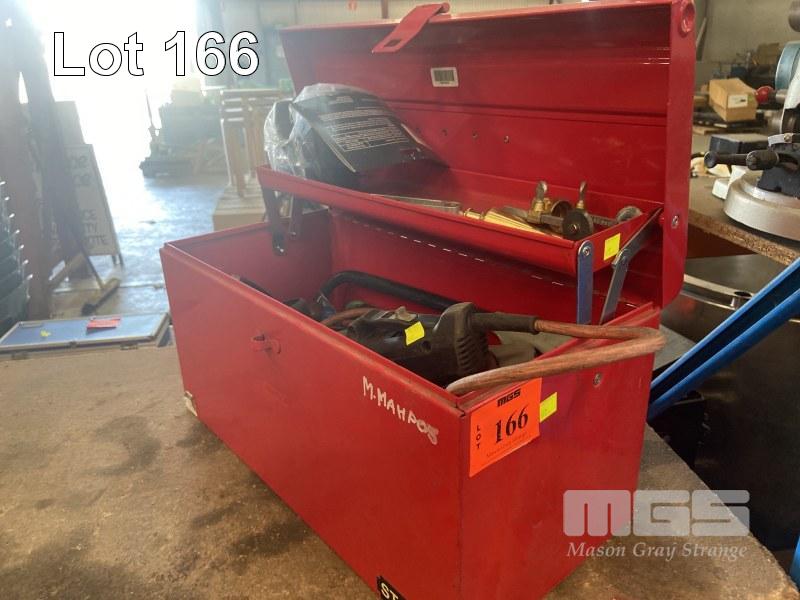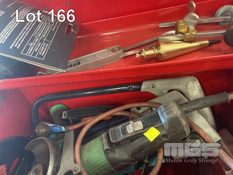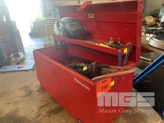 TOOLBOX & ASSORTED HAND TOOLS, INC HACKS AWS, CLAMPS, MEASURING TAPES, PROTRACTORS, MAGNETIC WELDING CLAMP BLOCKS & HITACHI ANGLE GRINDER, 125mm, 240V