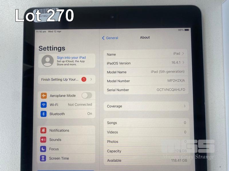 APPLE iPAD (5TH GEN), 128GB, Wi-Fi, SPACE GREY, MODEL A1822, MP2H2X/A WITH CABLE & CHARGER S/N:GCTVNCQAHLFD