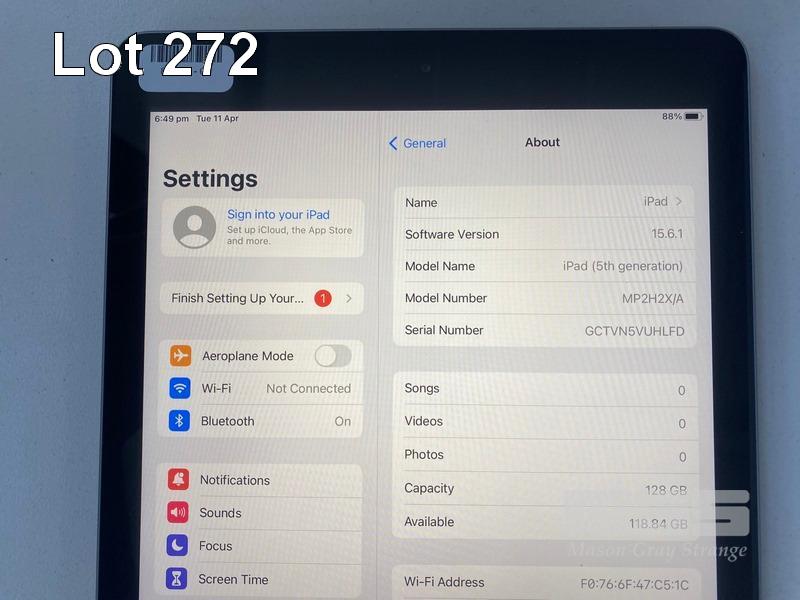 APPLE iPAD (5TH GEN), 128GB, Wi-Fi, SPACE GREY, MODEL A1822, MP2H2X/A WITH CABLE & CHARGER S/N:GCTVN5VUHLFD