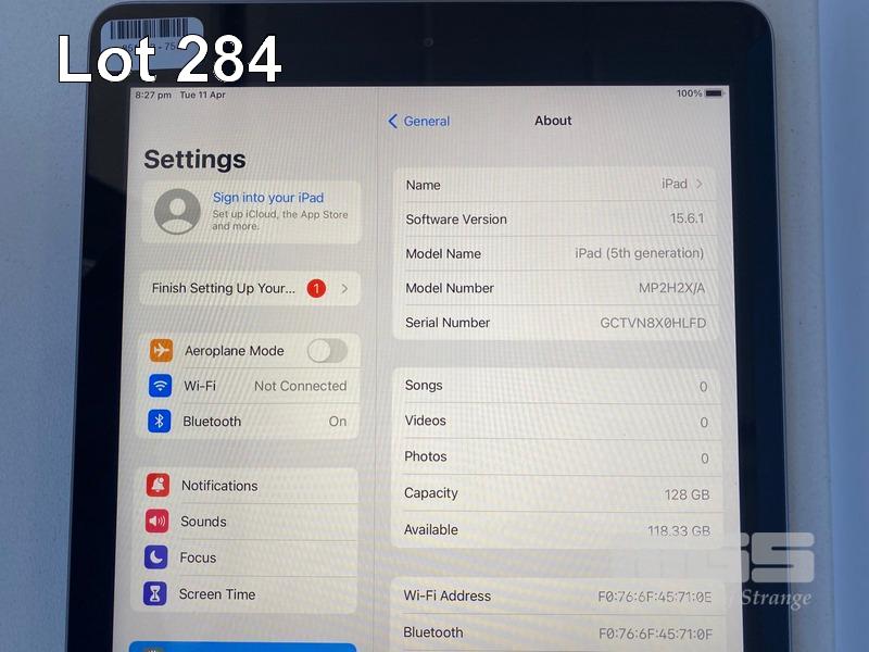 APPLE iPAD (5TH GEN), 128GB, Wi-Fi, SPACE GREY, MODEL A1822, MP2H2X/A WITH CABLE & CHARGER S/N:GCTVN8X0HLFD