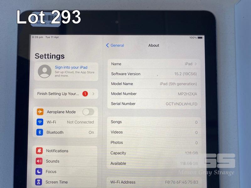 APPLE iPAD (5TH GEN), 128GB, Wi-Fi, SPACE GREY, MODEL A1822, MP2H2X/A WITH CABLE & CHARGER S/N:GCTVNDLWHLFD