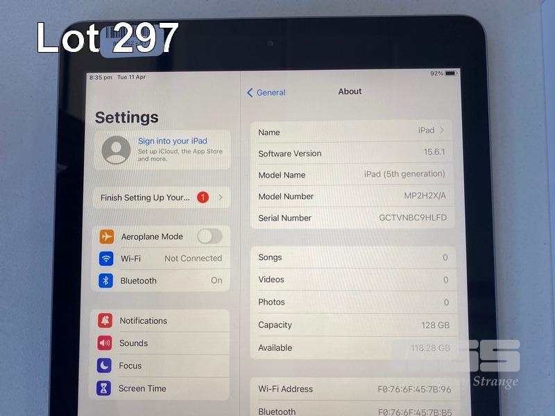 APPLE iPAD (5TH GEN), 128GB, Wi-Fi, SPACE GREY, MODEL A1822, MP2H2X/A WITH CABLE & CHARGER S/N:GCTVNBC9HLFD