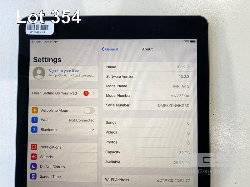 APPLE iPAD AIR 2, 32GB, Wi-Fi, SPACE GREY, MODEL A1566, MNV22X/A (NO CABLE, NO CHARGER) S/N:DMPSYKNHHG5D