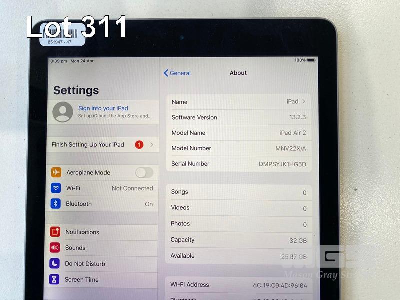 APPLE iPAD AIR 2, 32GB, Wi-Fi, SPACE GREY, MODEL A1566, MNV22X/A (NO CABLE, NO CHARGER) S/N:DMPSYJK1HG5D