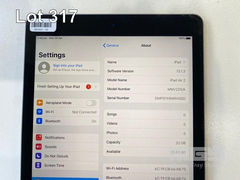 APPLE iPAD AIR 2, 32GB, Wi-Fi, SPACE GREY, MODEL A1566, MNV22X/A (NO CABLE, NO CHARGER) S/N:DMPSYHNWHG5D