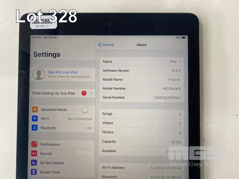 APPLE iPAD AIR, 32GB, Wi-Fi, SPACE GREY, MODEL A1474, MD786X/B (NO CABLE, NO CHARGER) S/N:DMPQX2FKFK11