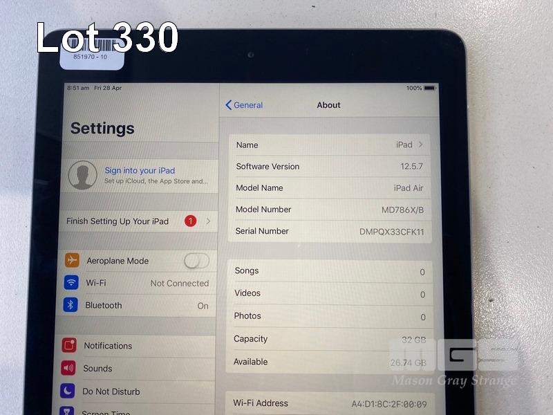 APPLE iPAD AIR, 32GB, Wi-Fi, SPACE GREY, MODEL A1474, MD786X/B (NO CABLE, NO CHARGER) S/N:DMPQX33CFK11
