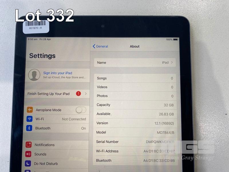 APPLE iPAD AIR, 32GB, Wi-Fi, SPACE GREY, MODEL A1474, MD786X/B (NO CABLE, NO CHARGER) S/N:DMPQWKMDFK11