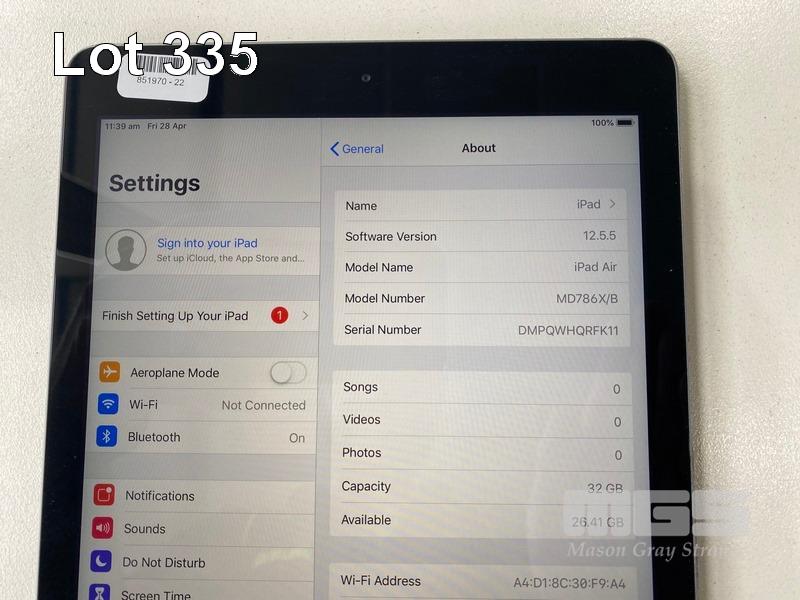APPLE iPAD AIR, 32GB, Wi-Fi, SPACE GREY, MODEL A1474, MD786X/B (NO CABLE, NO CHARGER) S/N:DMPQWHQRFK11
