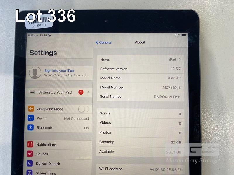 APPLE iPAD AIR, 32GB, Wi-Fi, SPACE GREY, MODEL A1474, MD786X/B (NO CABLE, NO CHARGER) S/N:DMPQX1ALFK11