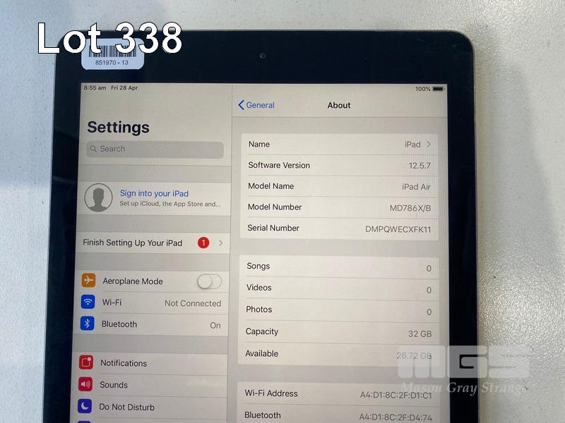 APPLE iPAD AIR, 32GB, Wi-Fi, SPACE GREY, MODEL A1474, MD786X/B (NO CABLE, NO CHARGER) S/N:DMPQWECXFK11