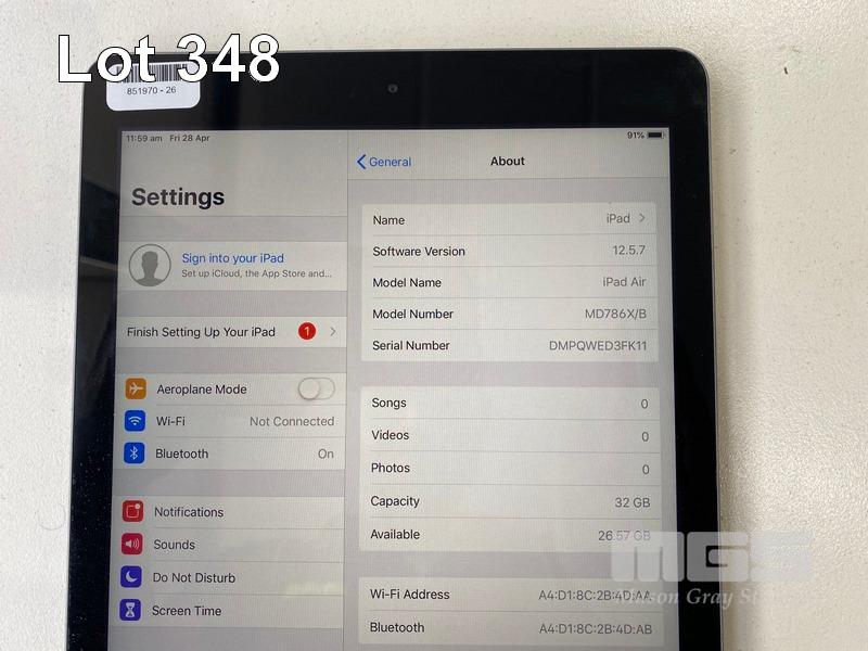 APPLE iPAD AIR, 32GB, Wi-Fi, SPACE GREY, MODEL A1474, MD786X/B (NO CABLE, NO CHARGER) S/N:DMPQWED3FK11