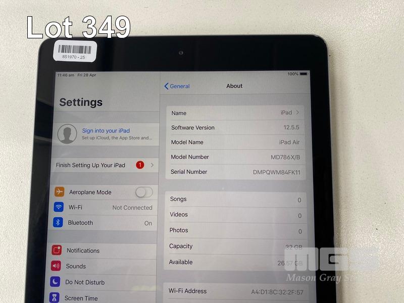APPLE iPAD AIR, 32GB, Wi-Fi, SPACE GREY, MODEL A1474, MD786X/B (NO CABLE, NO CHARGER) S/N:DMPQWM84FK11