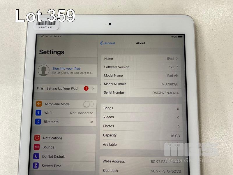 APPLE iPAD AIR, 16GB, Wi-Fi, SILVER, MODEL A1474, MD788X/B (NO CABLE, NO CHARGER) S/N:DMQNZEN3FK14