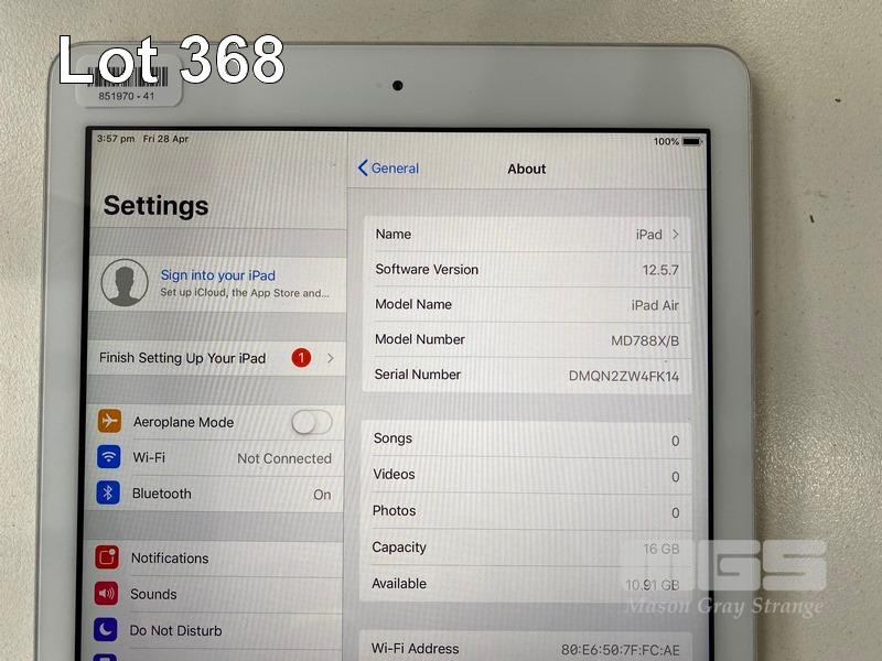 APPLE iPAD AIR, 16GB, Wi-Fi, SILVER, MODEL A1474, MD788X/B (NO CABLE, NO CHARGER) S/N:DMQN2ZW4FK14