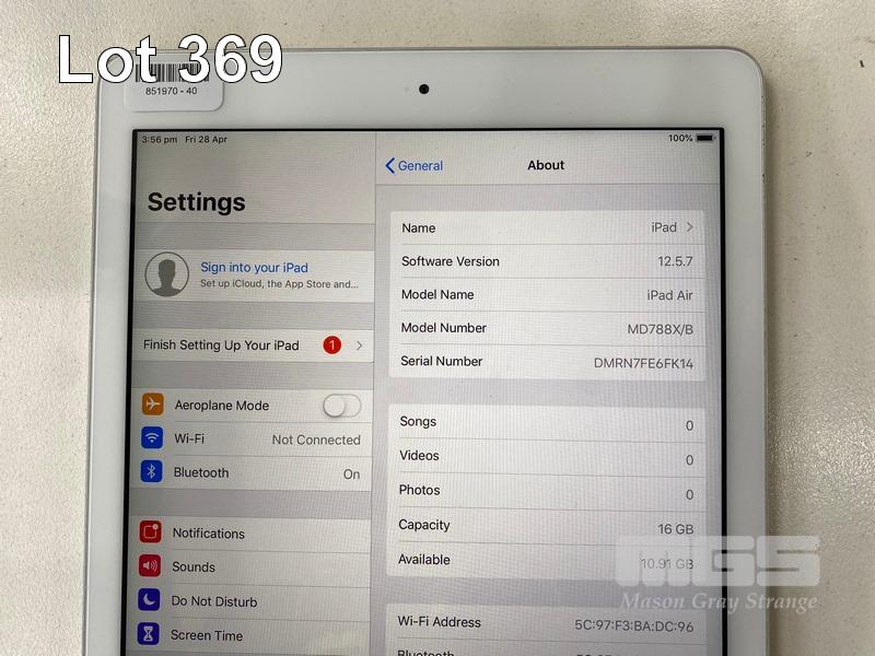 APPLE iPAD AIR, 16GB, Wi-Fi, SILVER, MODEL A1474, MD788X/B (NO CABLE, NO CHARGER) S/N:DMRNZFE6FK14