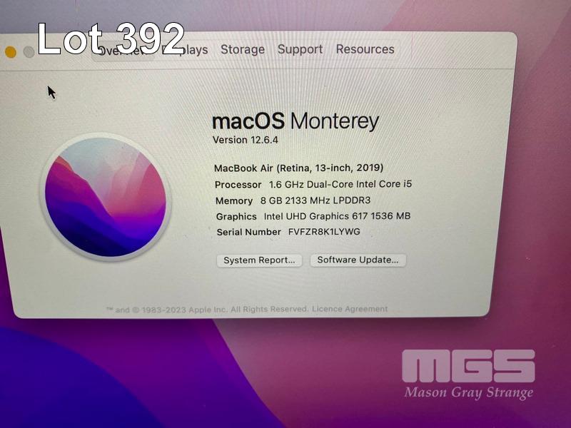 LAPTOP, APPLE MACBOOK AIR (A1932), CORE i5 8210Y (8TH GEN) @ 1.6GHz, 8GB DDR3 RAM, 128GB SSD, 13.3" RETINA WIDESCREEN (2560x1600), INTEL UHD GRAPHICS 617, Wi-Fi, BLUETOOTH, MAC OS 12.6 INSTALLED & USB-C POWER SUPPLY (NOTE: MINOR DAMAGE TO SCREEN) S/N:FVFZR8K1LYWG