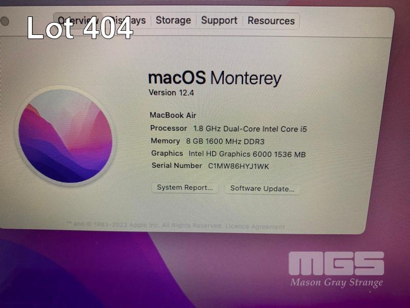 LAPTOP, APPLE MACBOOK AIR (A1466), CORE i5 5350U (5TH GEN) @ 1.8GHz, 8GB DDR3 RAM, 128GB SSD, 13.3" WIDESCREEN (1440x900), INTEL HD GRAPHICS 6000, Wi-Fi, BLUETOOTH, MAC OS 12 INSTALLED & POWER SUPPLY S/N:C1MW86HYJ1WK