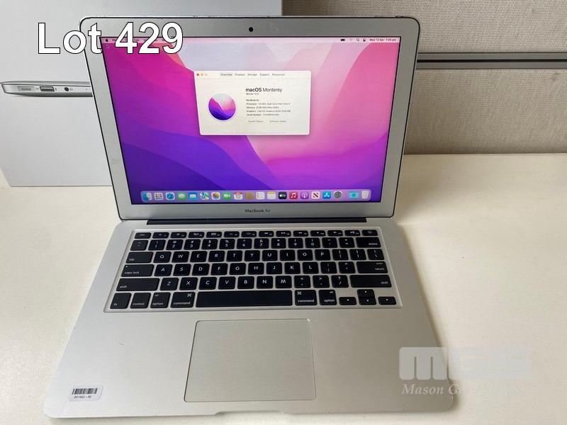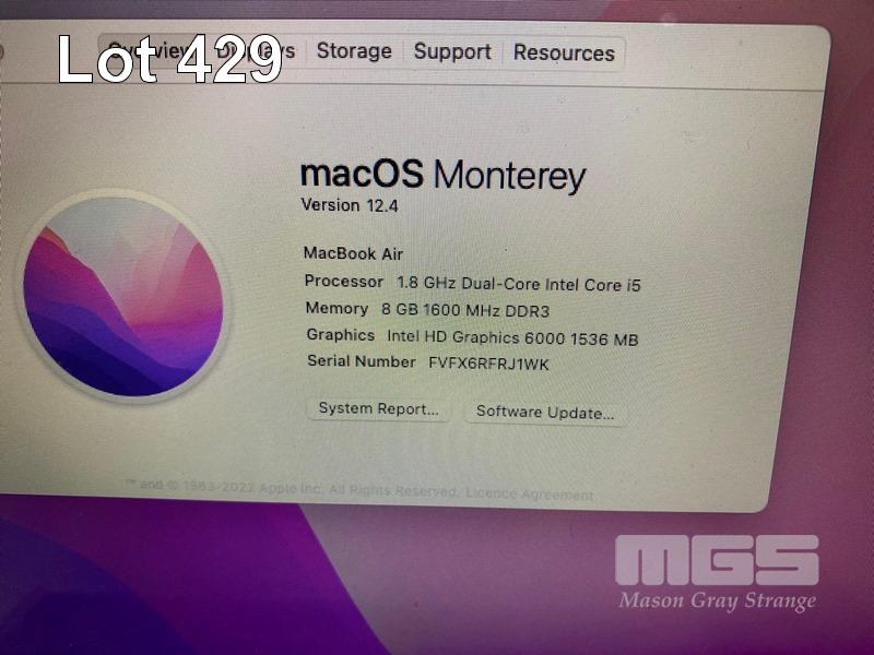 LAPTOP, APPLE MACBOOK AIR (A1466), CORE i5 5350U (5TH GEN) @ 1.8GHz, 8GB DDR3 RAM, 128GB SSD, 13.3" WIDESCREEN (1440x900), INTEL HD GRAPHICS 6000, Wi-Fi, BLUETOOTH, MAC OS 12 INSTALLED & POWER SUPPLY (NOTE: MINOR DAMAGE TO CASING) S/N:FVFX6RFRJ1WK