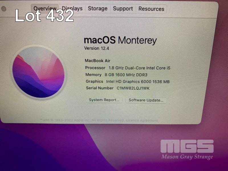 LAPTOP, APPLE MACBOOK AIR (A1466), CORE i5 5350U (5TH GEN) @ 1.8GHz, 8GB DDR3 RAM, 128GB SSD, 13.3" WIDESCREEN (1440x900), INTEL HD GRAPHICS 6000, Wi-Fi, BLUETOOTH, MAC OS 12 INSTALLED & POWER SUPPLY (NOTE: MINOR DAMAGE TO CASING, BATTERY NOT CHARGING) S/N:C1MW82LQJ1WK