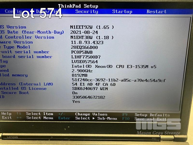 LAPTOP, LENOVO THINKPAD P50 MOBILE WORKSTATION, TYPE 20EQ, XEON E3-1535M v5 @ 2.9GHz, 8GB DDR4 RAM, 512GB M.2 SSD, 15.6" WIDESCREEN (1920x1080), 4GB NVIDIA QUADRO M2000M VIDEO, Wi-Fi, BLUETOOTH, WINDOWS 10 PRO INSTALLED (NO POWER SUPPLY) (NOTE: MINOR MARKS ON SCREEN) S/N:PC0P5BWB